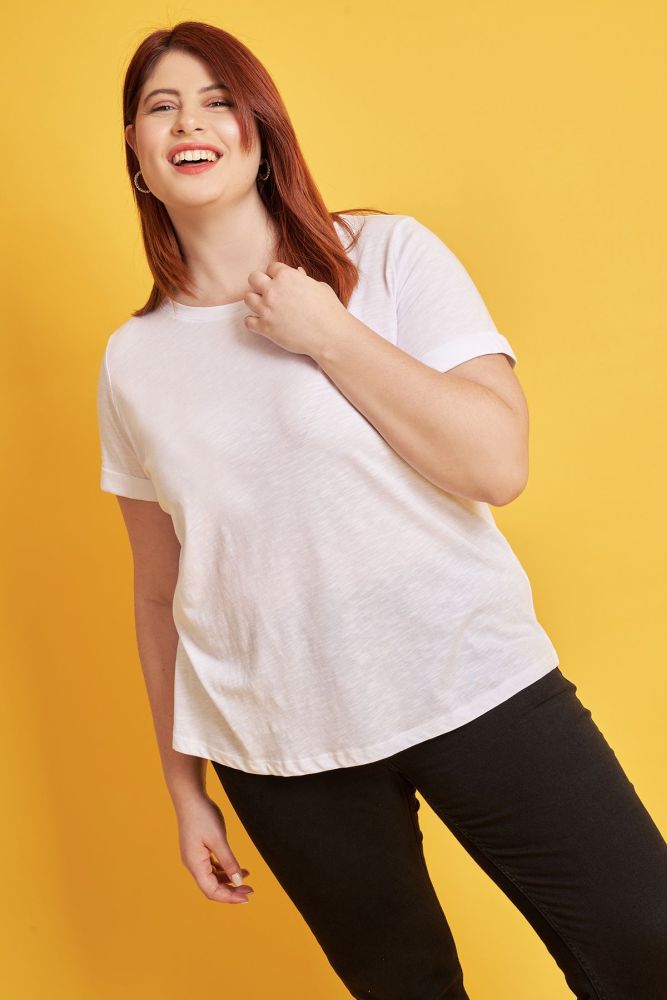 Basic μπλούζα από βαμβακερή φλάμα με στρογγυλή λαιμόκοψη. Κοντά μανίκια με ρεβέρ. Σε ίσια, ριχτή γραμμή. Το μοντέλο έχει ύψος 180 εκ, στήθος 106, μέση 88, περιφέρεια 117 και φοράει το μέγεθος S