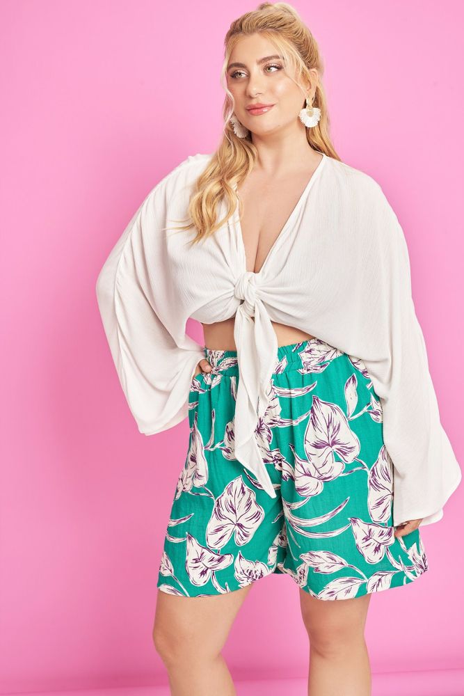 Μπολερό από ρεγιόν με όψη λινού. Δένει μπροστά και δημιουργεί V ντεκολτέ. Μακριά μανίκια καμπάνα. Το μοντέλο έχει ύψος 177εκ, στήθος 110, μέση 85, περιφέρεια 115 και φοράει μέγεθος S