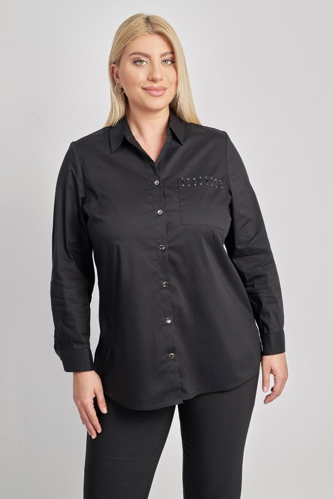 Πουκάμισο βαμβακερό με μακριά μανίκια. Γιακάς πουκαμίσου και κλείσιμο μπροστά με κουμπιά. Τσέπη μπροστά με διακόσμηση. Το μοντέλο έχει ύψος 177εκ, στήθος 110, μέση 85, περιφέρεια 115 και φοράει μέγεθος S