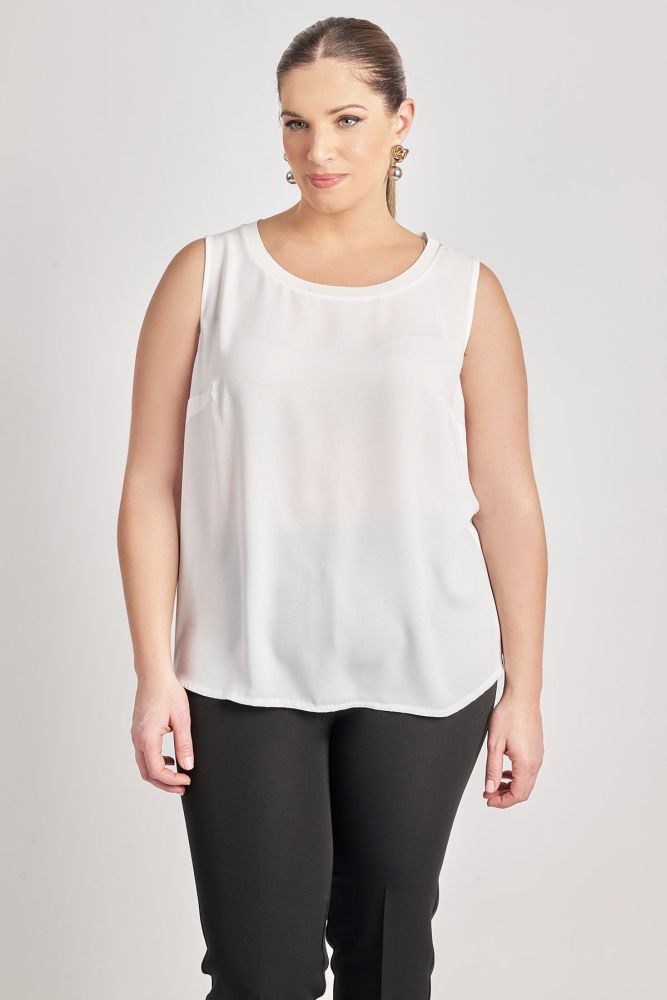 Αμάνικο μονόχρωμο τοπ. Στρογγυλή λαιμόκοψη με λεπτομέρεια ριπ. Το μοντέλο έχει ύψος 179 εκ, στήθος 109, μέση 89, περιφέρεια 119 και φοράει το μέγεθος S