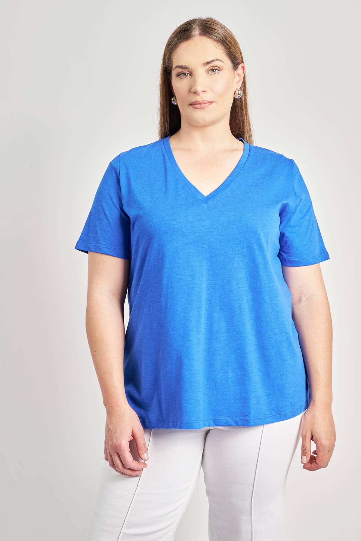 Κοντομάνικη μπλούζα σε βαμβακερή φλάμα. V λαιμόκοψη. Γραμμή-Α με στρογγυλεμένο τελείωμα. Μήκος που καλύπτει τους γοφούς. Συνδυάζεται τέλεια με τζιν και slim παντελόνια για casual chic εμφανίσεις. Ιδανική επιλογή για day-to-night looks οπου μπορεί να φορεθεί μέσα από ψηλόμεσα παντελόνια και να τονιστεί με statement αξεσουάρ. Το μοντέλο έχει ύψος 180 εκ, στήθος 107, μέση 95, περιφέρεια 122 και φοράει το μέγεθος S